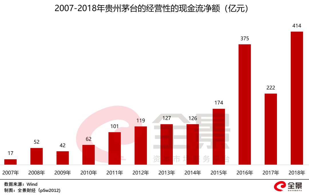 另一个衡量业绩质量的重要指标:现金流,茅台也非常出色。近几年,茅台的经营活动现金流量净额是远超同期的净利润,2018年创出新高414亿元,更是远超378亿元的净利润。