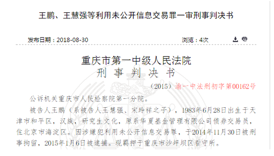 2018年3月28日,重庆市第一中级人民法院作出一审判决,以利用未公开信息交易罪,分别判处王鹏有期徒刑六年六个月,并处罚金900万元;判处宋玲祥有期徒刑四年,并处罚金690万元;判处王慧强有期徒刑三年六个月,并处罚金210万元。