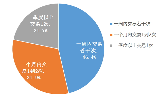 深交所在2019年对全国331个大中小城市的24074位股民进行了一个问卷调查显示,近一半的受访者一周内多次交易;超过30%的受访者一个月交易1到2次;仅两成受访者一个季度以上交易1次。月均交易5、6次是常态。