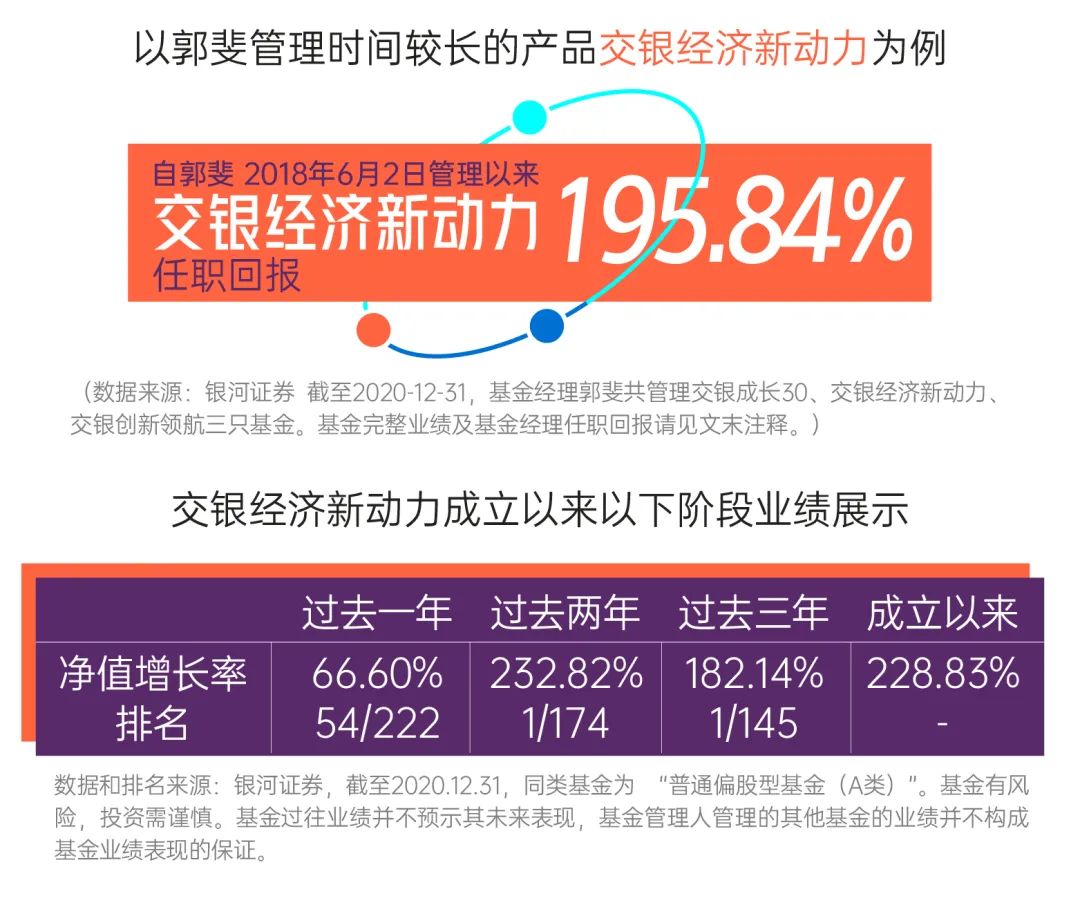 交银经济新动力/业绩比较基准(沪深300指数收益率*60%+中证综合债券指数收益率*40%)自2016年10月20日成立起至2016年年末收益率-1.21%/-0.82%、2017年17.98%/12.81%、2018年-15.23%/-12.93%、2019年99.78%/23.09%、2020H123.97%/2.27%。郭斐自2018/6/2管理交银经济新动力至今任职回报为195.84%,2018/6/2至当年年底任职回报为-0.78%。(上述业绩登载期间发生过基金经理变动,详见基金定期报告披露。)