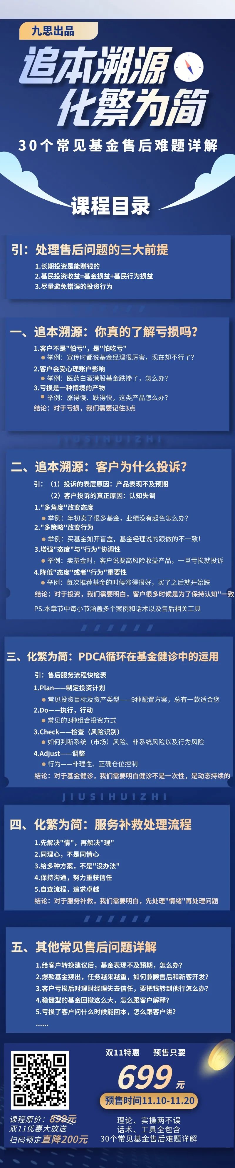 1.本专栏是我本人亲自录的,从“亏损”本源、到“投诉”真正原因、到基金健诊、到售后服务标准流程建立及“投诉升级的处理”,全流程、全链条全部视频讲解;