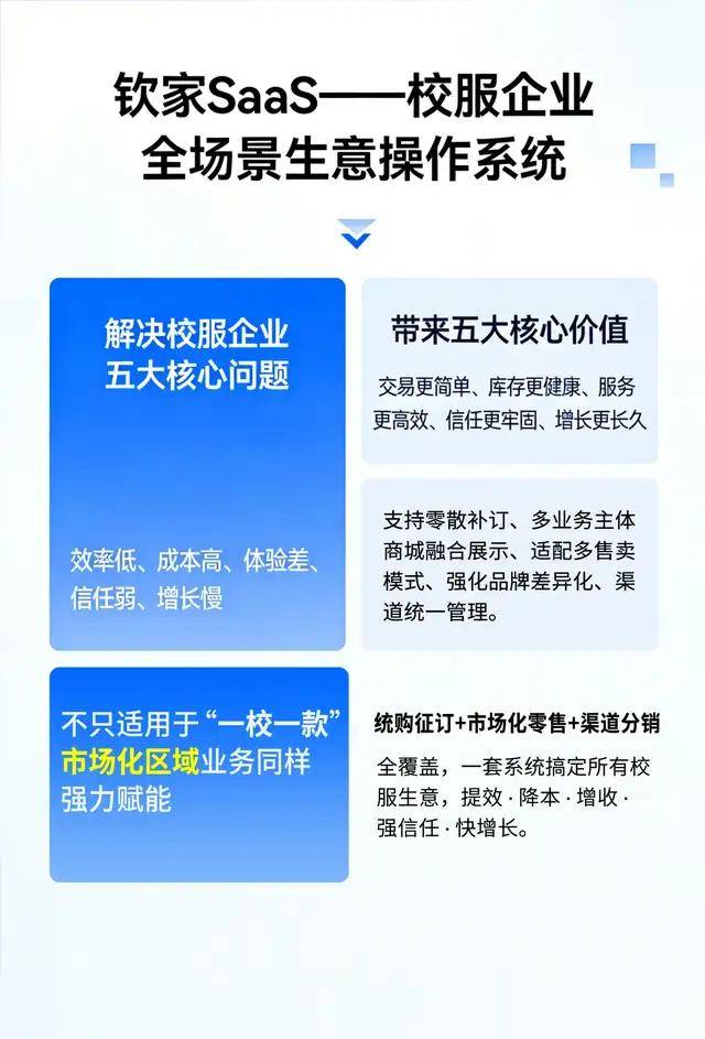 通过提供质量追溯、在线订购、售后反馈、数据决策等一体化能力,钦家SaaS系统从交易、库存、服务、信任、增长五大维度,帮助校服企业在新政策环境下,更高效地触达终端用户,更从容地应对C端市场的机遇与挑战——实现提效、降本、增收、强信任、快增长。