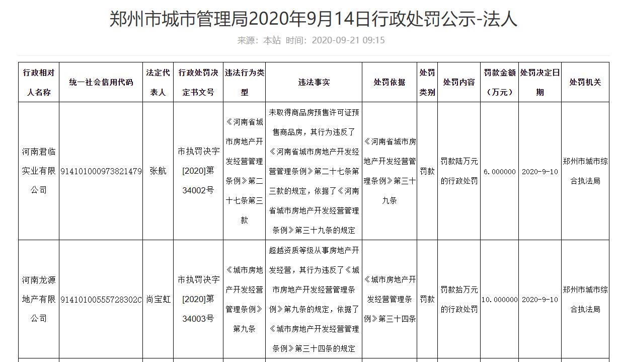 9月21日,因超越资质等级从事房地产开发经营、未取得商品房预售许可证预售商品房等行为,郑州市城市管理局对数家房地产企业依法进行处罚,其中涉及中亨建设、龙源地产等地方知名企业。