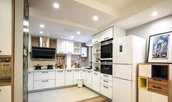 厨房的收纳空间非常多,其中还装有高立柜,用来存放电器,这样在使用的时候也更方便,冰箱正好放在橱柜旁,这样做饭时取菜会更近更方便。