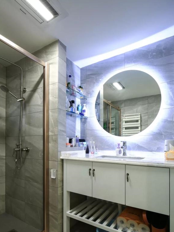 卫生间装有淋浴房,干湿分离的设计更加实用,不会弄得到处湿湿的,一面圆形的镜子结合灯光显得很有艺术性,白色的浴室柜带有收纳功能,收纳更方便。