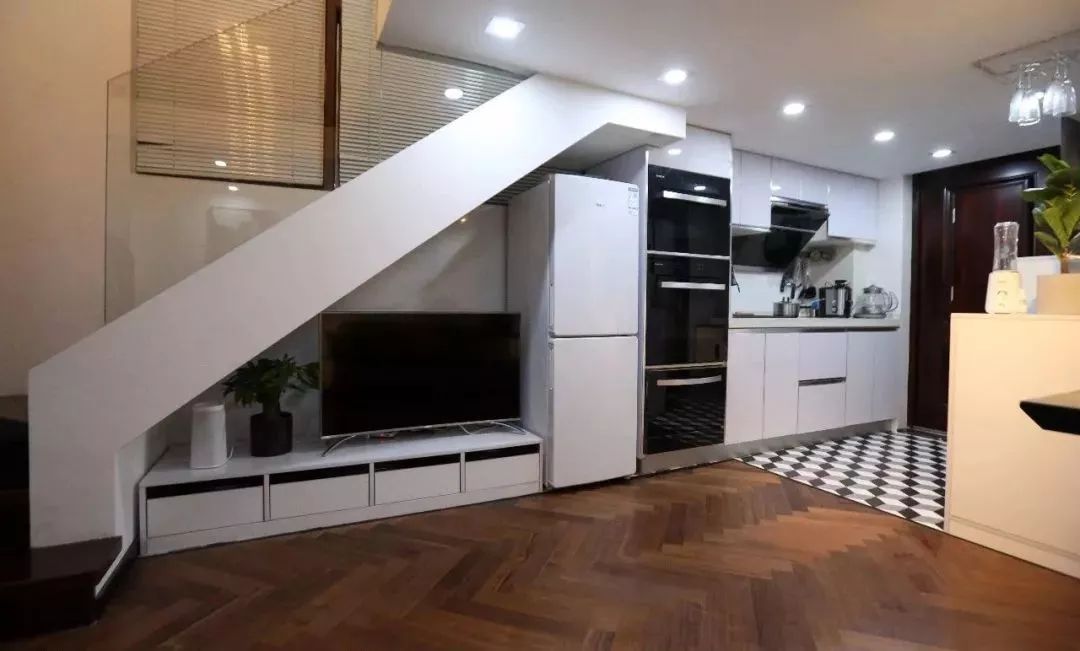 橱柜旁还定制了电器高柜,将常用厨房电器嵌入,节省空间,使用方便,冰箱摆放在楼梯下的三角区域,这里的空间被利用成客厅的电视墙,一排落地矮柜充当电视柜,兼具储物和置物功能,时尚又实用。实木楼梯采用玻璃护栏,美观通透不压抑。