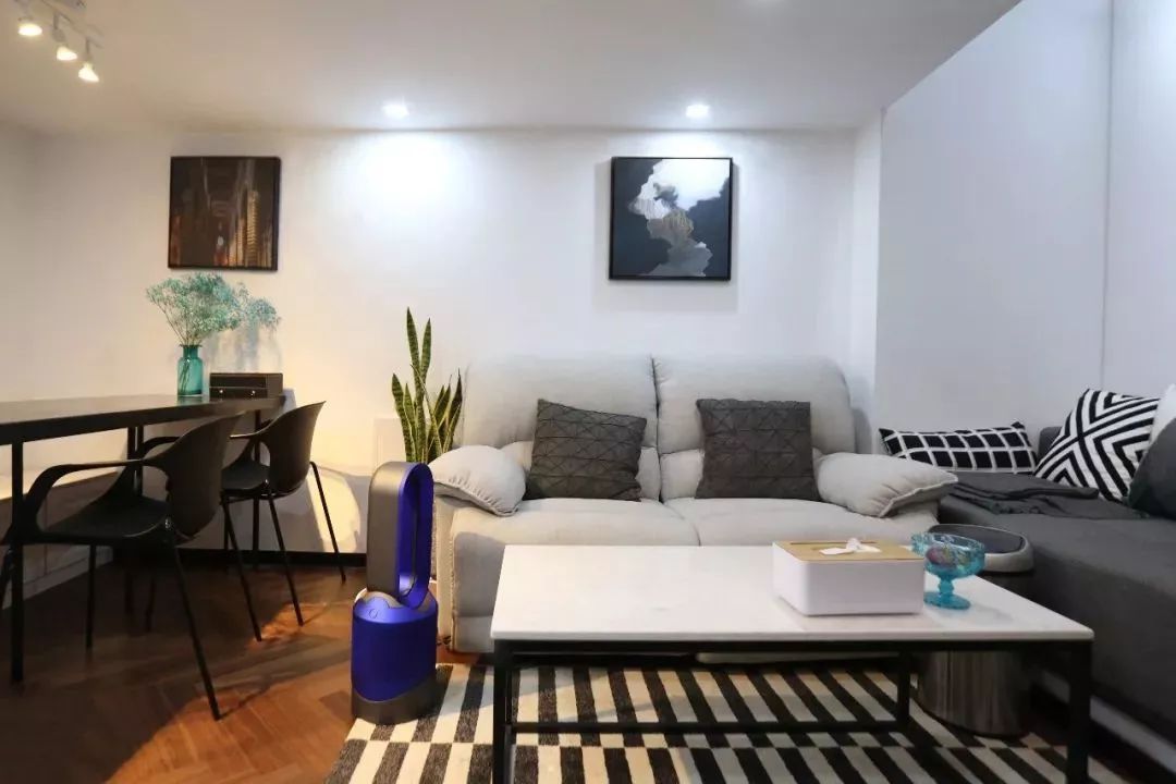 餐厅在玄关柜对面,一张黑色的长方实木餐桌搭配相同风格的餐椅,在蓝色花瓶、插花和装饰挂画等点缀下,营造出温馨雅致的用餐氛围。餐厅旁是客厅区域,通过绿植做分区,浅灰色的双人沙发与深灰色的休闲沙发组合,搭配一个白色大理石面的方形茶几,,在黑白条纹的地毯衬托下,时尚舒适大气。