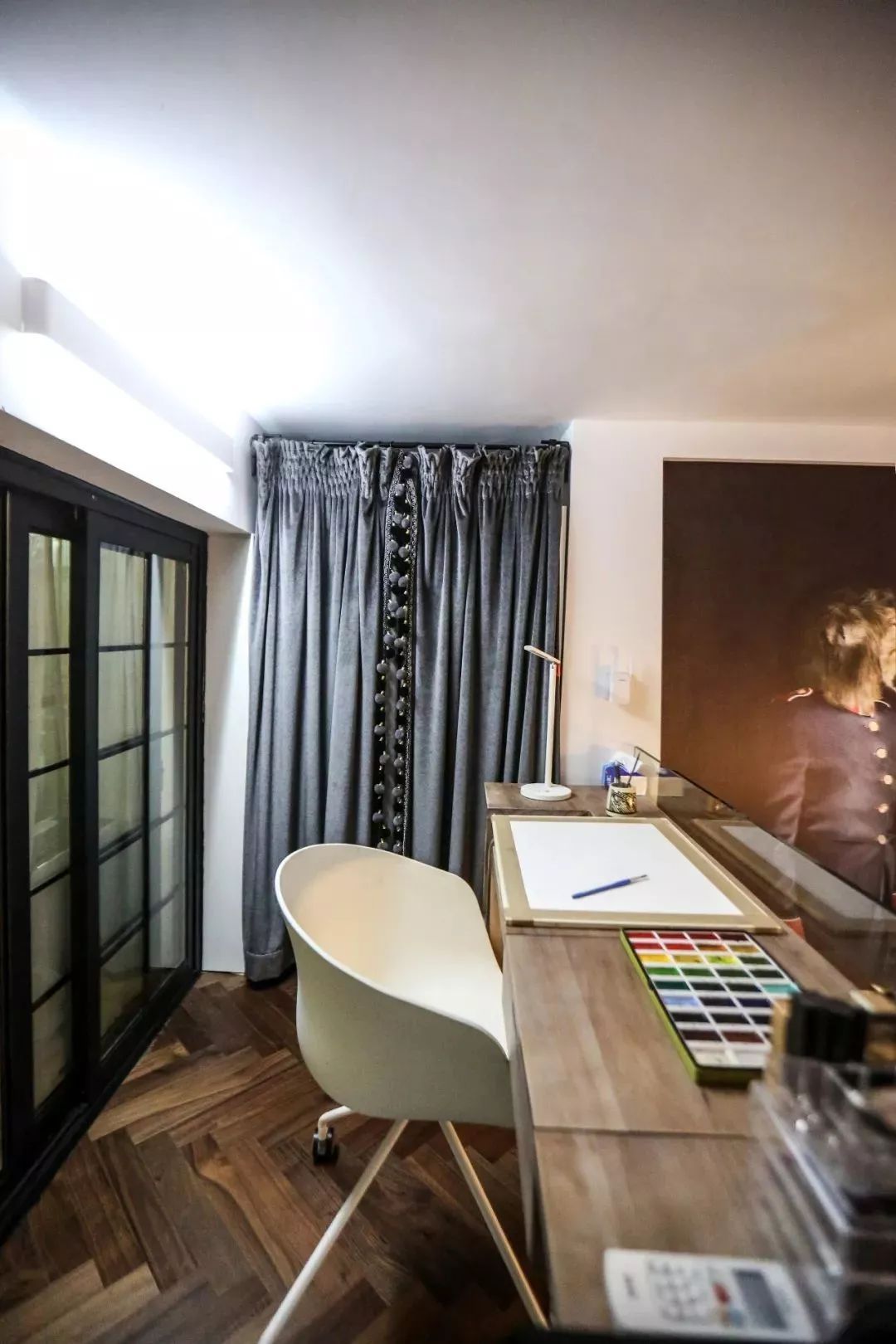 从楼梯进入到二层,楼梯护栏旁放一张实木工作台和小座椅,为女孩规划出一个工作区,坐在这里临时办公十分安静。
