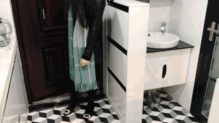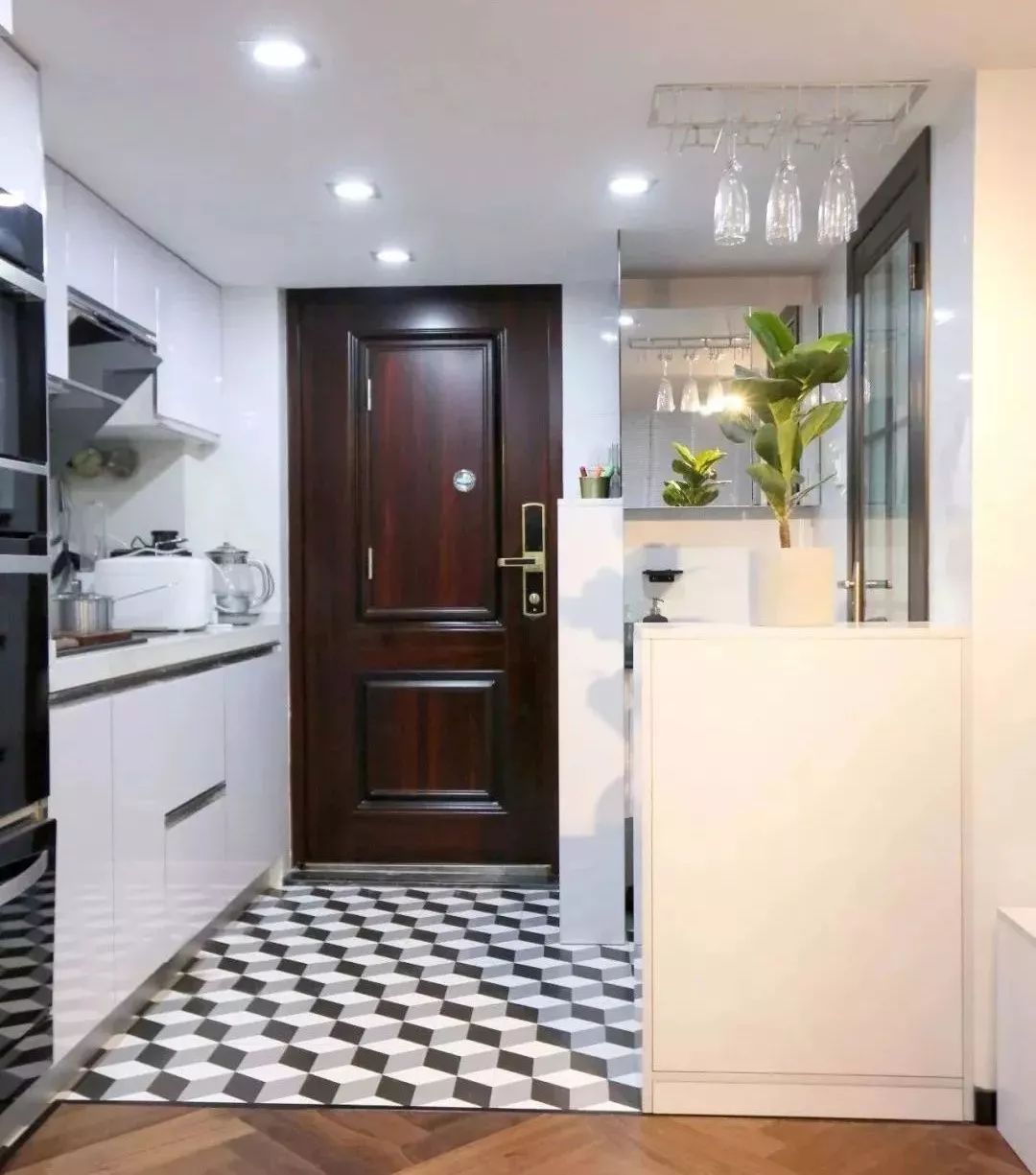 洗手台旁是通向卫生间的外面,对面放一个矮柜,上层收纳常用物品,下层收纳拖鞋等,同时可以起到视觉缓冲的作用。玄关处与厨房共用的地面采用黑白灰三色拼接地砖铺设,很有立体感,与室内地板形成区域分隔。