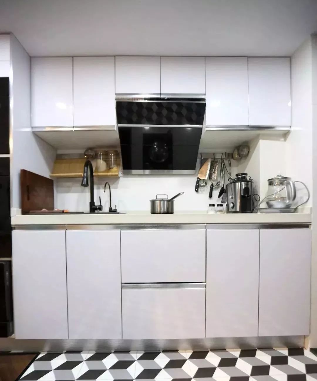 入户门右侧是厨房区域,一字型厨房定制了白色整体橱柜,满足女孩日常烹饪和美食制作、厨具收纳的基本需求。