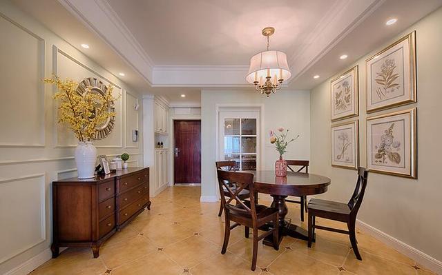 餐厅配套的餐桌椅子和餐边柜,两边墙面都做了简单装饰,看起来不会太单调。餐边柜这边统一用pu线条做了简易造型。如果只做沙发背景的话,感觉看着好变扭,所幸就一起做了。