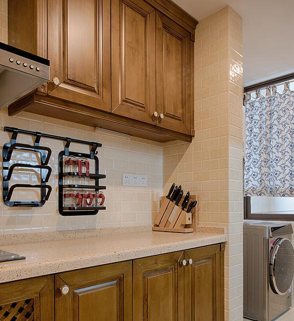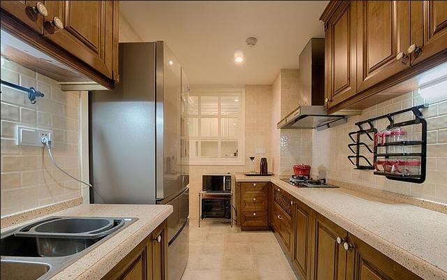 厨房设计的还行,使用起来没什么大问题。水槽和冰箱一边,灶台单独一边。很多人说水槽和灶台不能相对,就分开,冰箱离的近使用比较方便。生活阳台就在厨房里头,就搞了个洗衣机就是。