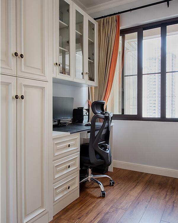 衣柜做了满满一大排,一点也不担心收纳问题了。还特意买了一体式书桌柜,给以后孩子学习用的,这样空间比较独立完整吧。
