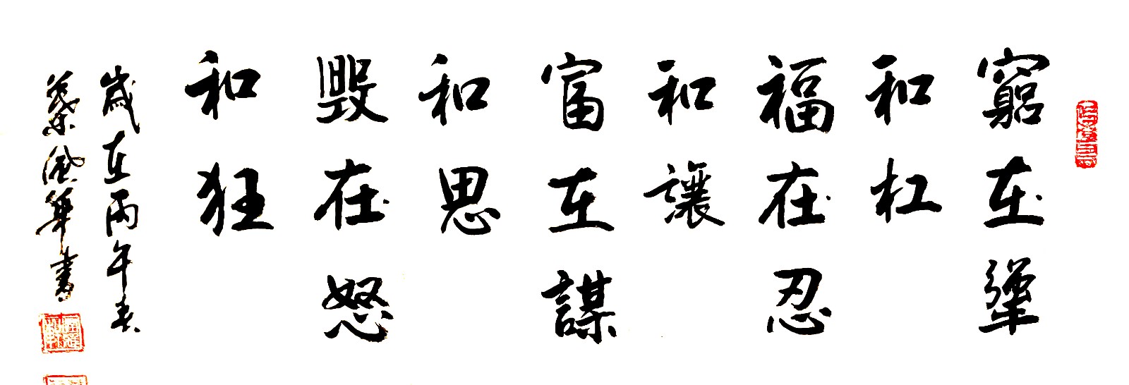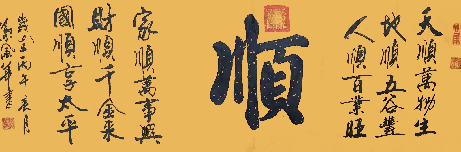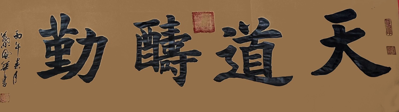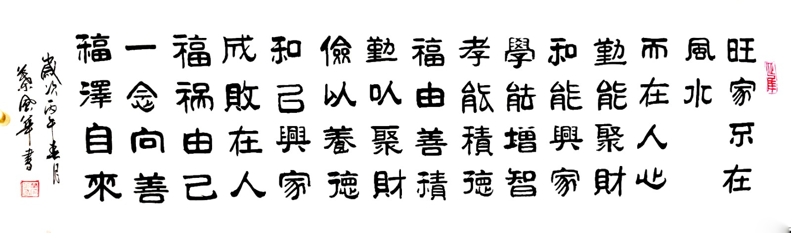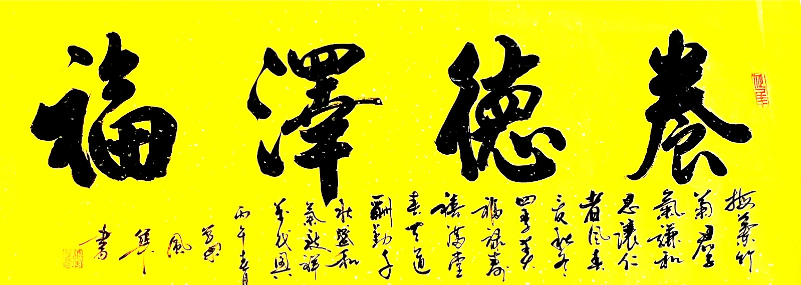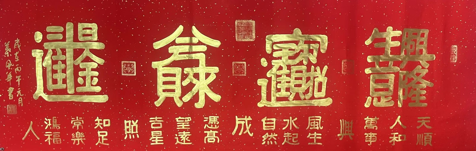细观叶风华近年创作的隶书条屏,如“厚德载物”“天赐鸿福”等作品,不难发现一个显著特点:结字宽博,气象开张,横画如担山之力,波磔有凌云之势。这种雄强豪迈的风格,与他早年生活的磨砺密切相关。苦难未曾使他消沉,反而锻造出一种百折不挠的生命力。他的书法,正是这种生命力的外化——每一笔都掷地有声,每一画都饱含力量,却又在力量中透出一种从容与淡定。更难得的是,他的大字作品气势撼人,小字作品则精微含蓄,无论尺幅大小,都能做到“大而不空,小而不弱”,显示出他对笔墨语言极强的驾驭能力。