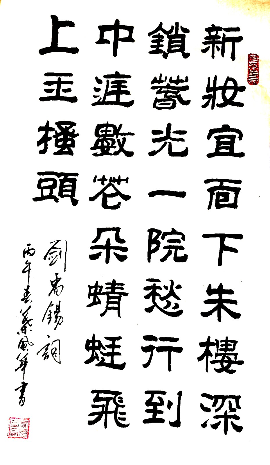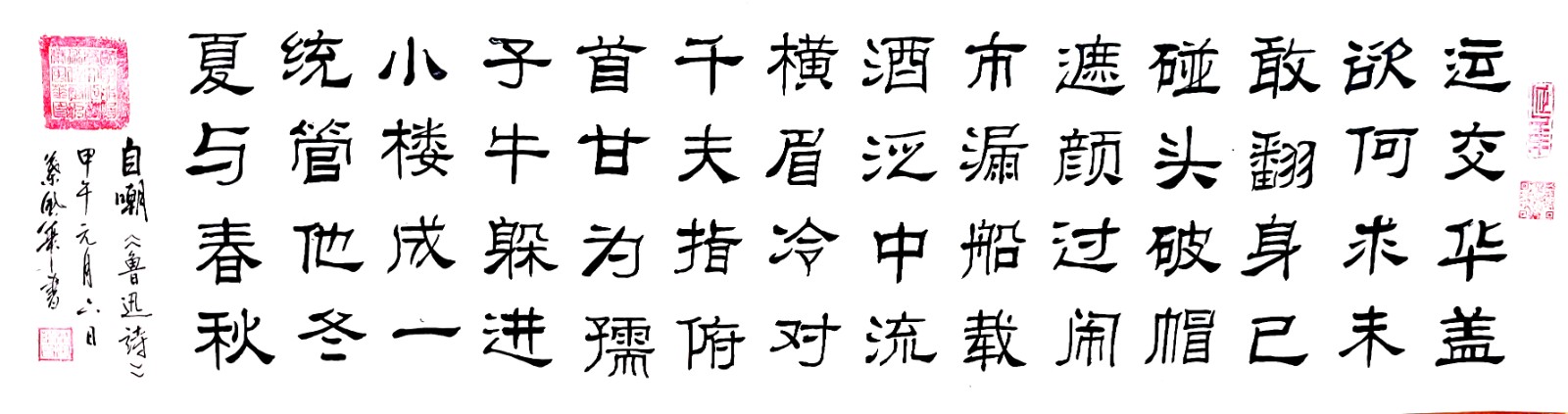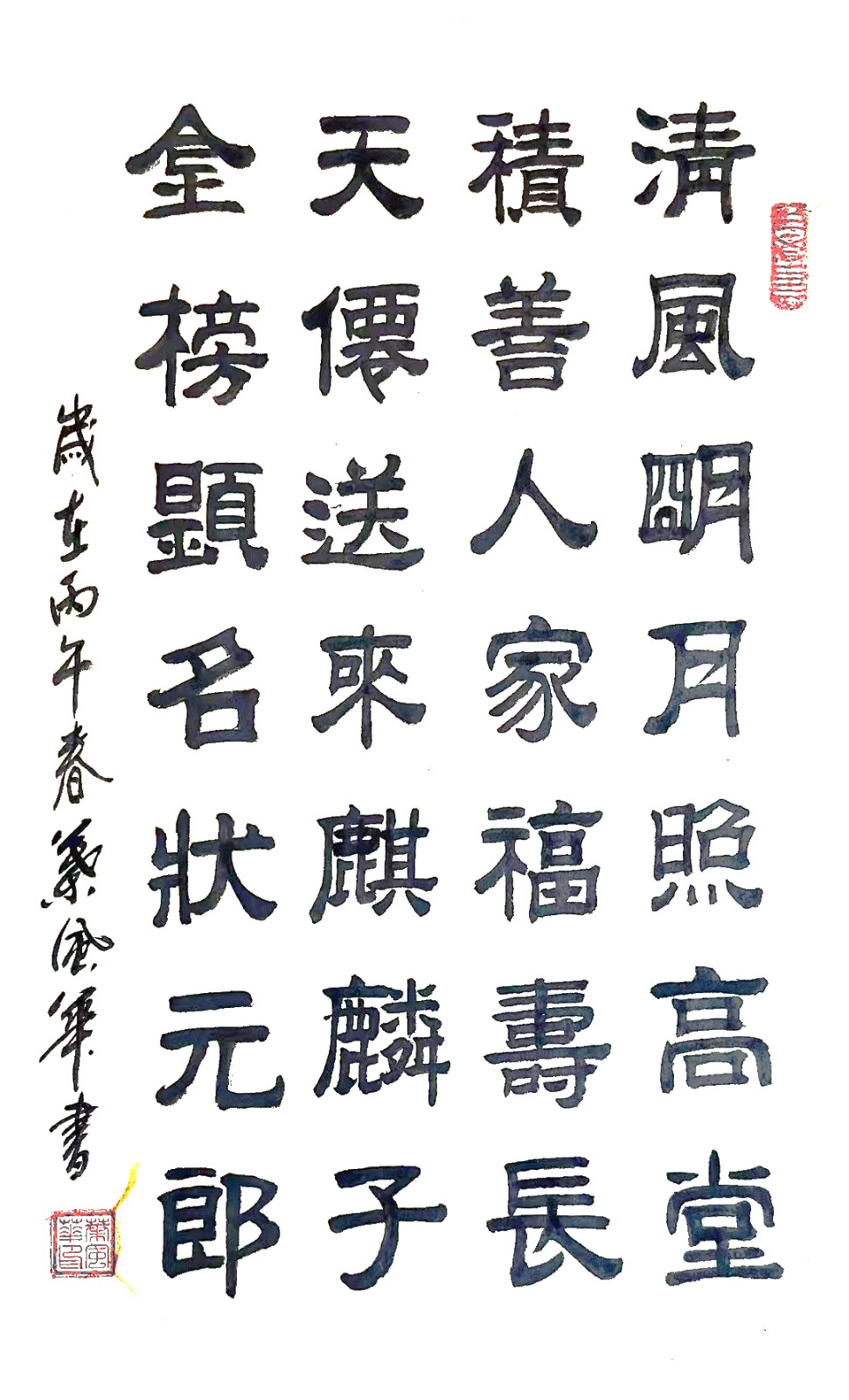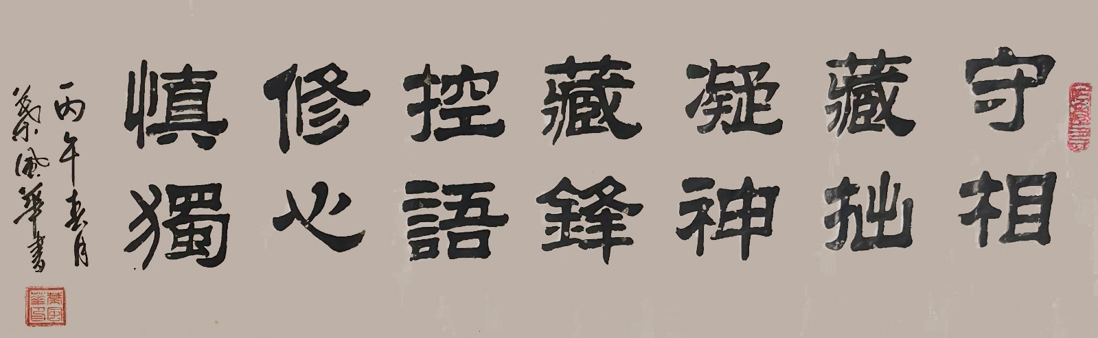 尤为值得关注的是,叶风华并未止步于帖学的研习,他对隶书投入了持续而深入的热情。近年来,他对刘炳森的隶书情有独钟,反复临习,心追手摹。刘炳森隶书以汉隶为根基,结体严谨、线条厚重、气象博大,叶风华在此基础上融入了自己对行草书的理解,使笔下隶书既有汉碑的古拙朴茂,又不失灵动的气韵。他的楷隶书作“端朴若古佛之容”,方整奇逸中见飞动之势,工稳俊丽间显浩然之气,在当代隶书创作中自成格局。